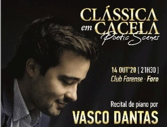 Vasco Dantas estará no Club Farense em Faro de onde, a partir das 21:30 do dia de Outubro próximo, será efetuada a transmissão em direto, a partir da página do Facebook do recital /Clássica em Cacela.