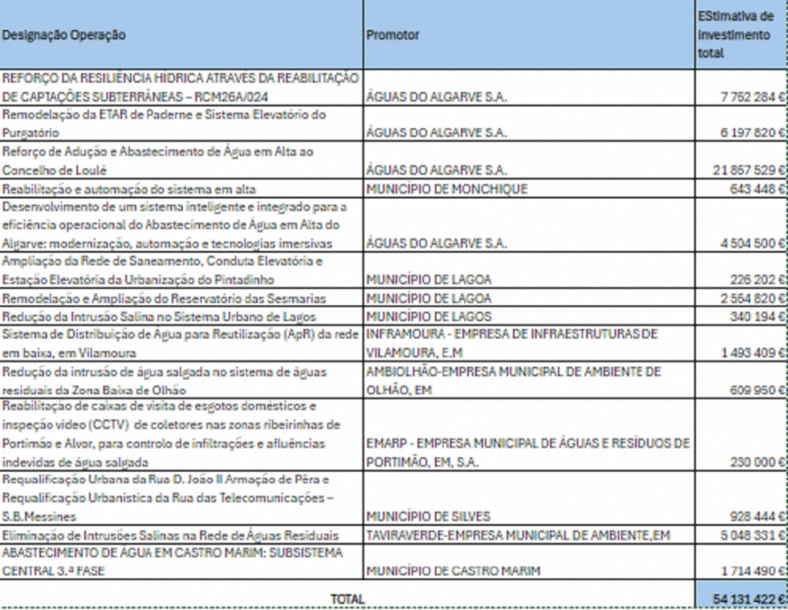 As operações envolvem entidades como Águas do Algarve, EMARP e os municípios de Lagos, Lagoa, Castro Marim, Portimão, Silves, Olhão e Monchique. A aprovação das candidaturas está prevista para julho.